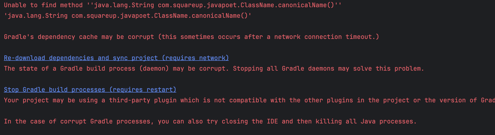 최신버전(2.50)의 dagger-compiler 는 내부에서, square 사가 만든 JavaPoet 을 사용합니다. 좀 더 구체적으로는 Hilt를 사용하는 클래스 경로를 집계(Aggregate)하는 용도로 JavaPoet 를 사용하지만, java.lang.String com.squareup.javapoet.ClassName.canonicalName() 메서드를 찾지 못하는 것이 에러의 원인 입니다.