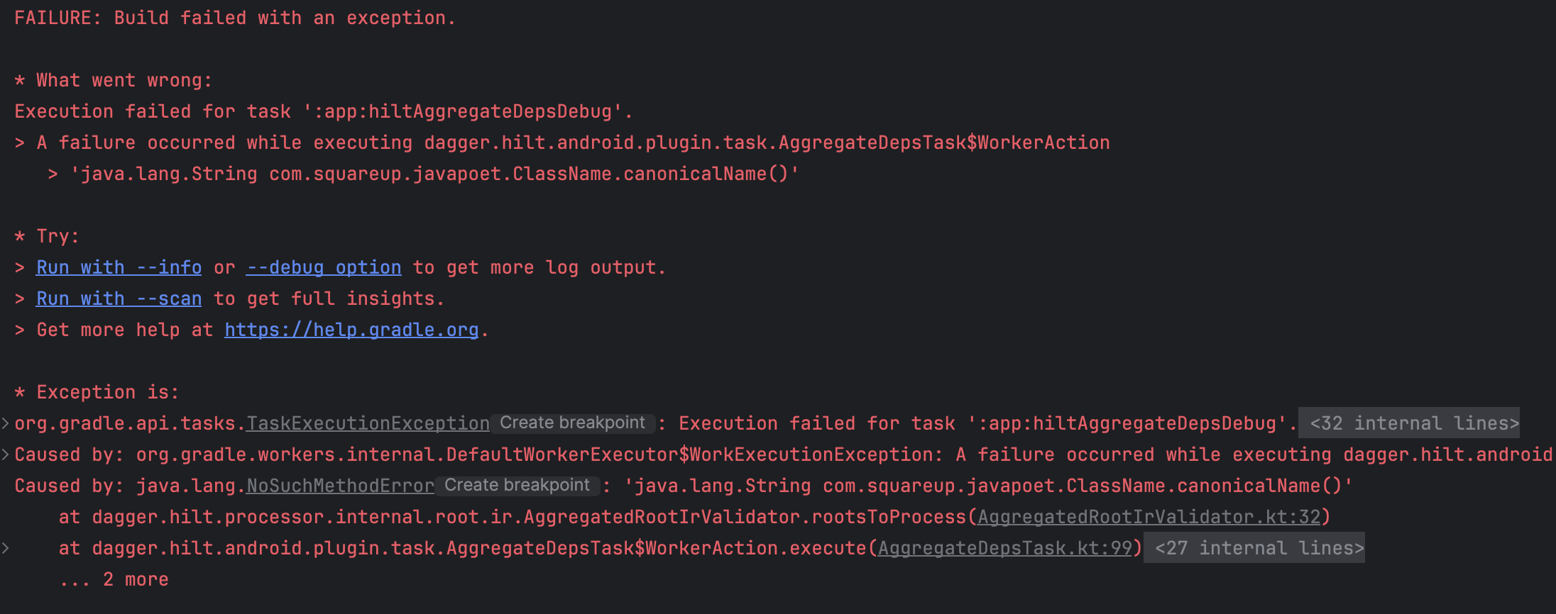 FAILURE: Build failed with an exception. * What went wrong: Execution failed for task ':app:hiltAggregateDepsDebug'. > A failure occurred while executing dagger.hilt.android.plugin.task.AggregateDepsTask$WorkerAction > 'java.lang.String com.squareup.javapoet.ClassName.canonicalName()'